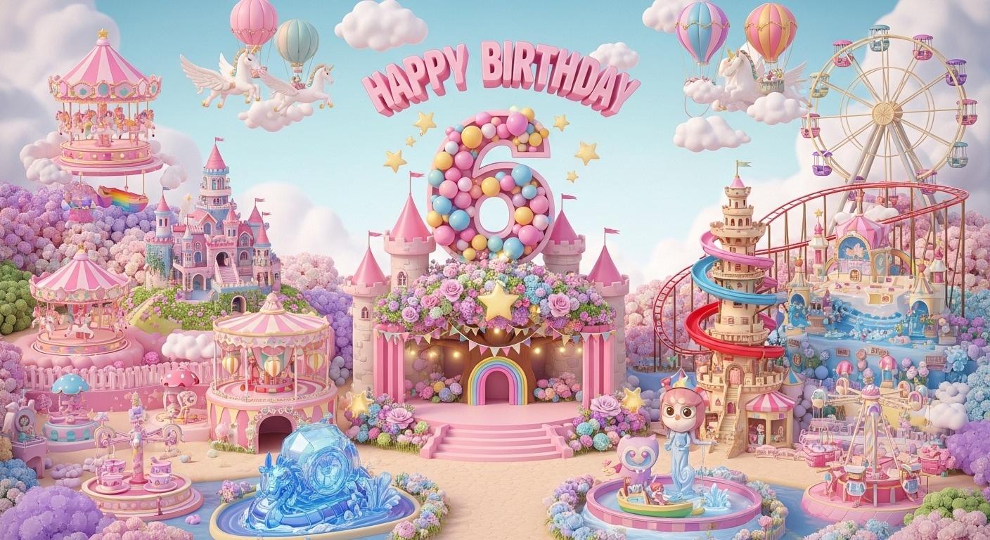 Customization Tip: Add a Personal Touch Make the backdrop extra special by adding your daughter’s name in a fun, 3D chibi font—think curly, sparkly letters in pink or gold that match the theme. Place it above the “HAPPY 6th BIRTHDAY” sign or near the rainbow treehouse castle, so it’s visible in photos but doesn’t overpower the design. It’s a small detail that makes the backdrop feel totally unique to her, and it’ll make her birthday photos even more meaningful.