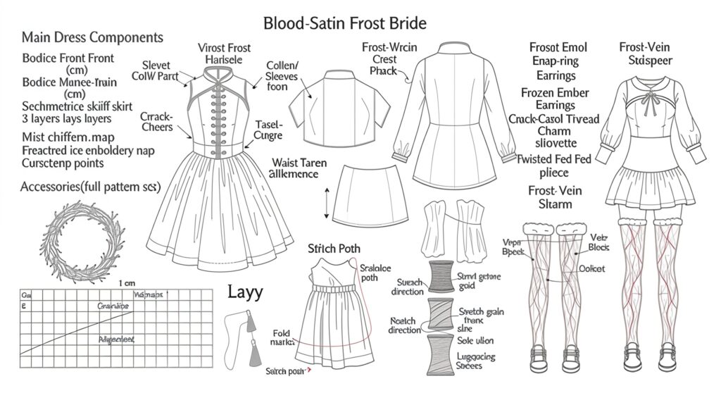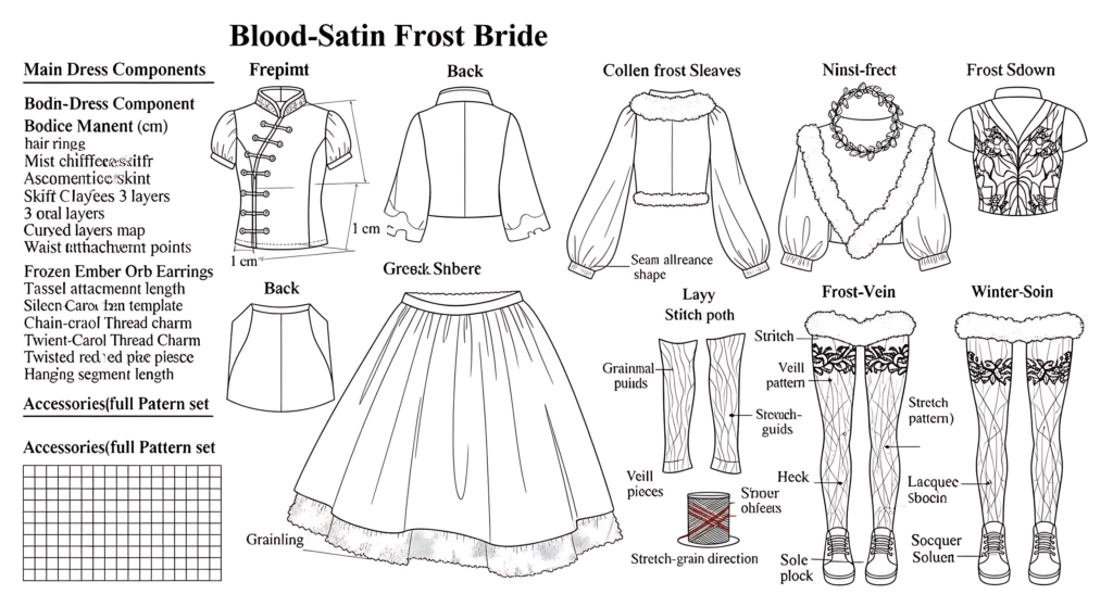 Each part is designed with precise sewing-pattern details, measurements, and construction notes for reliable creation in both crafting and digital modeling.