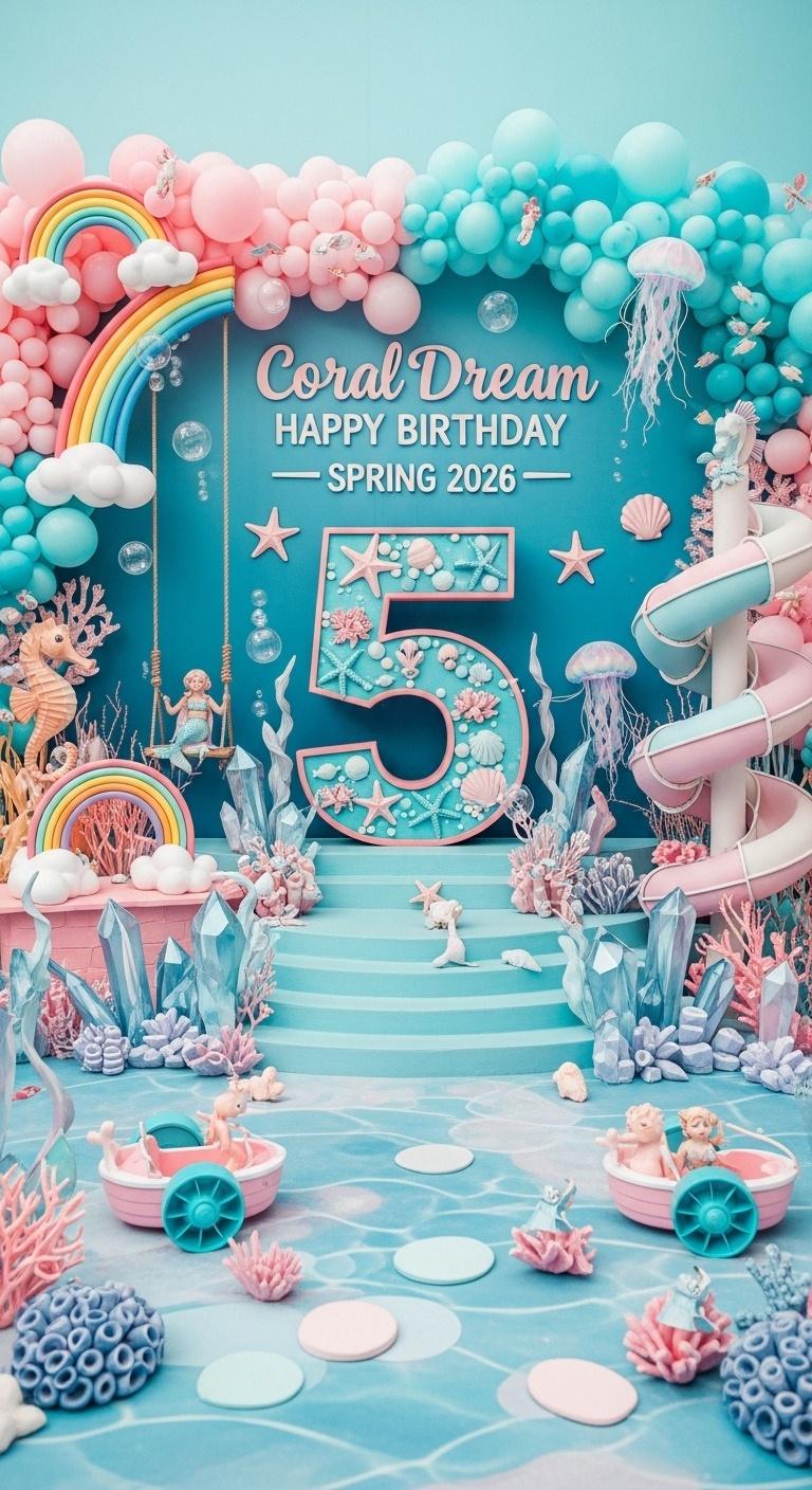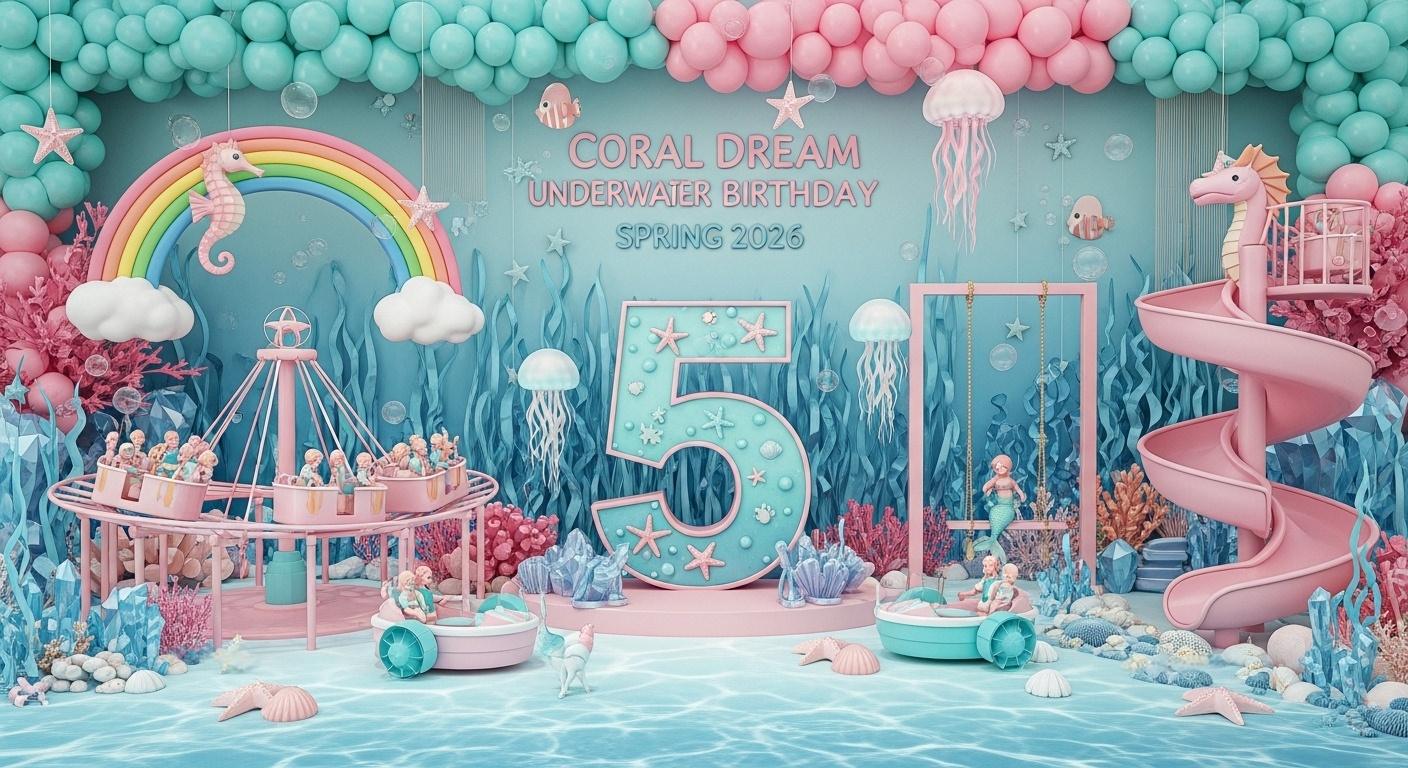 Step into the Coral Dream Underwater Birthday Kingdom, a whimsical fantasy world perfect for girls celebrating their 5th birthday in spring 2026. This colorful underwater party backdrop blends playful elements like the Rainbow Seahorse Coaster, Mermaid Lagoon Paddle Boats, Jellyfish Swing, and Coral Dragon Spiral Slide with delicate decorative touches—floating bubbles, starfish beams, and coral flowers—creating a scene designed to delight both children and parents.