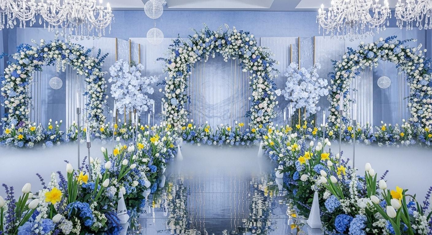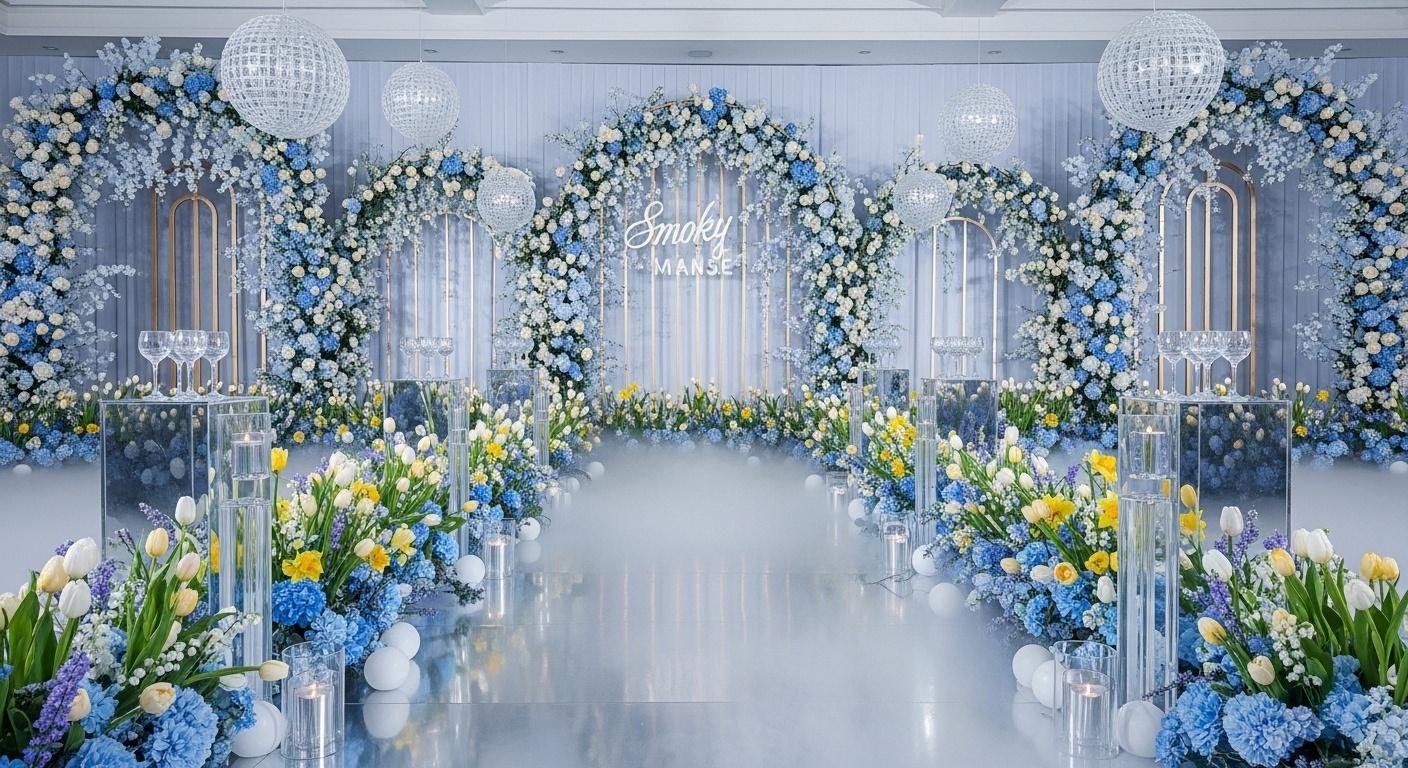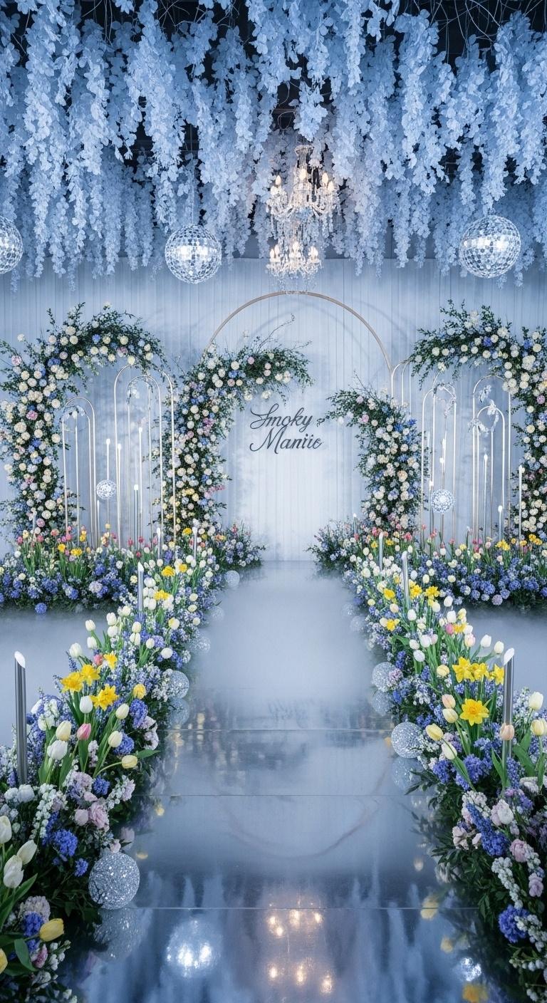 Step into the Smoky Blue Crystal Manor, and suddenly, the manor feels alive. Mirrored floors reflect soft fog curling around champagne gold accents, while floating flower spheres hover like captured whispers. Tulips, lily of the valley, and eucalyptus are carefully arranged, but nothing is stiff—petals spill naturally, drifting across mirrored walkways and into light shafts from crystal chandeliers.