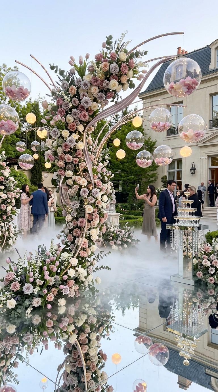 A: Absolutely. Floating Flower Spheres, mirrored floors, and micro-LED lights create photogenic depth indoors or outdoors. Adjust fog density for natural light exposure, letting petals and metallic curves capture changing hues.