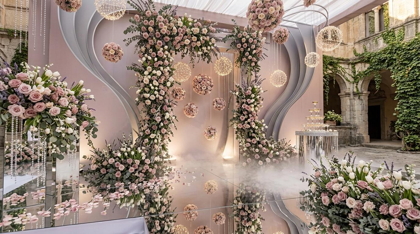 A: Morning sunlight enhances dusty rose and champagne tones naturally; evening micro-LED lighting combined with fog creates a soft magical ambiance. Floating Flower Spheres and mirrored floors interact beautifully in both scenarios.