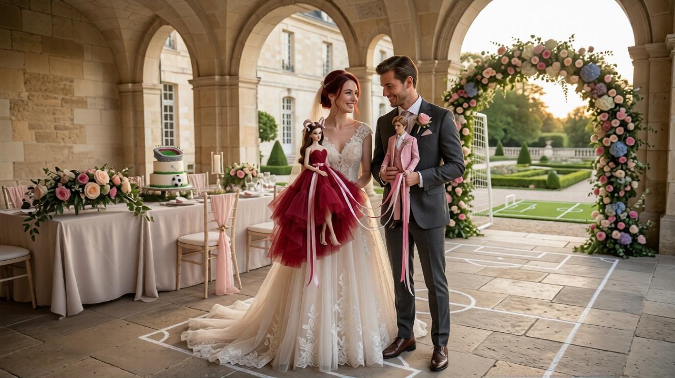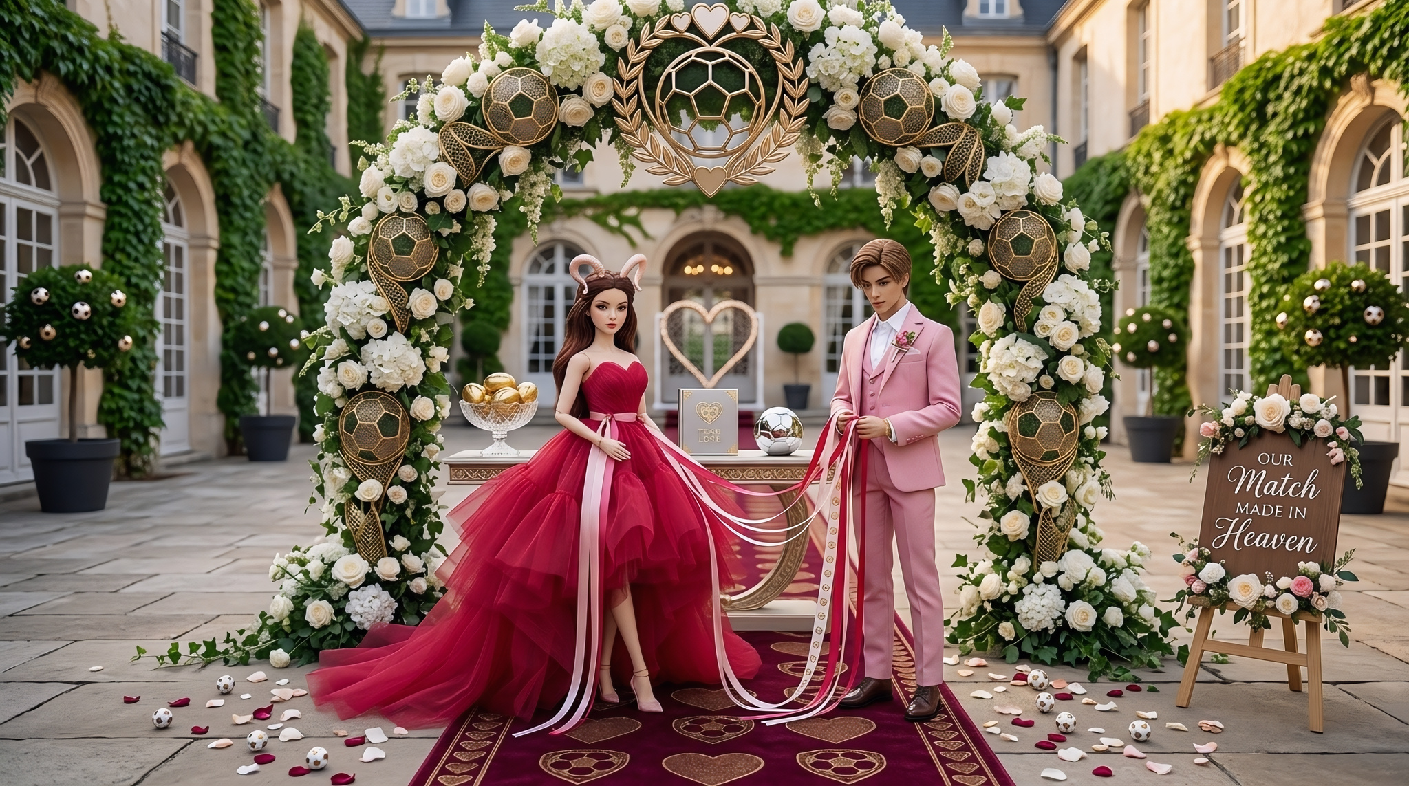 AI-generated scene of Aries bride and Libra groom dolls on miniature French garden football pitch, interactive ribbons visible