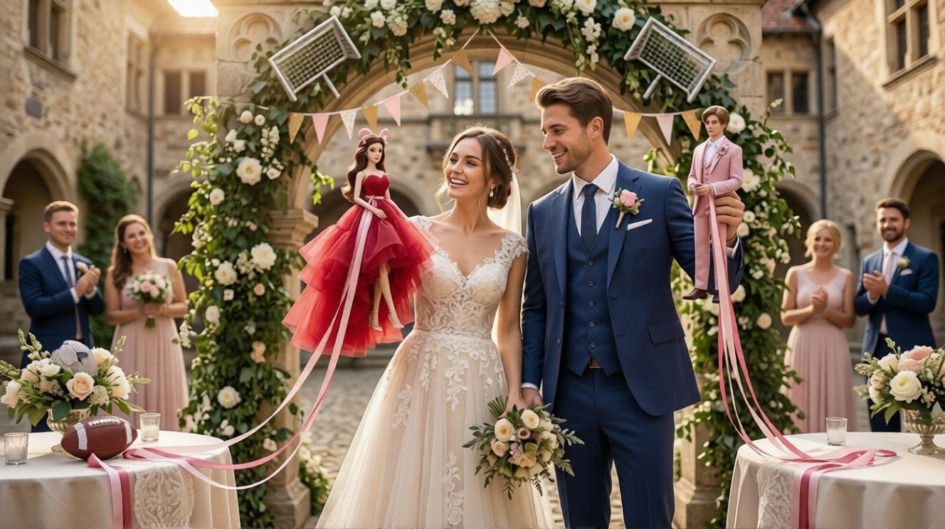 A Whimsical Aries Bride in Ruby Gown and Libra Groom in Soft Pink Suit, Football-Themed Wedding Dolls Capturing 2026 Spring Romance and Garden Inspiration