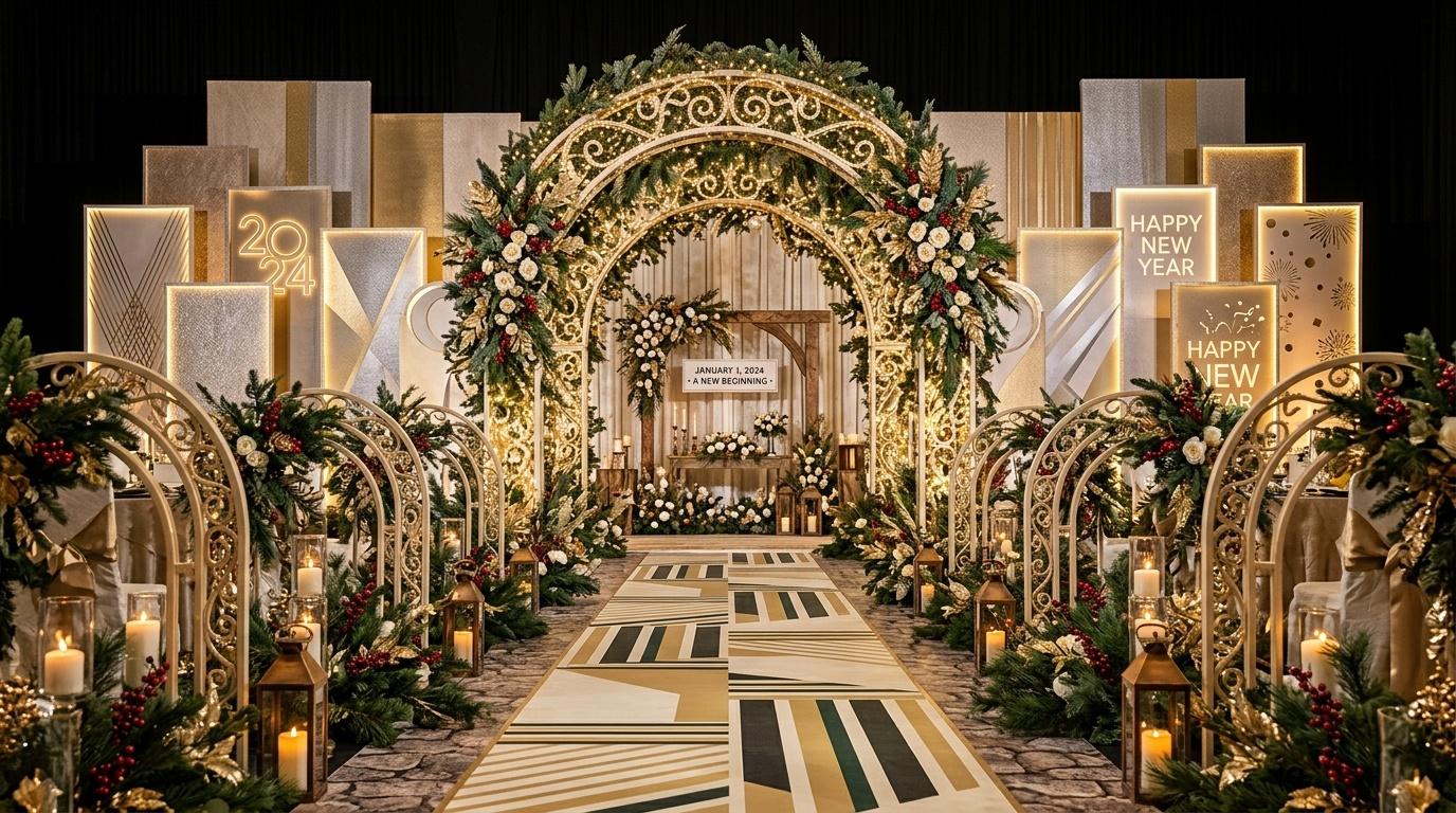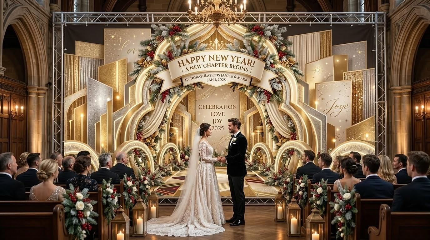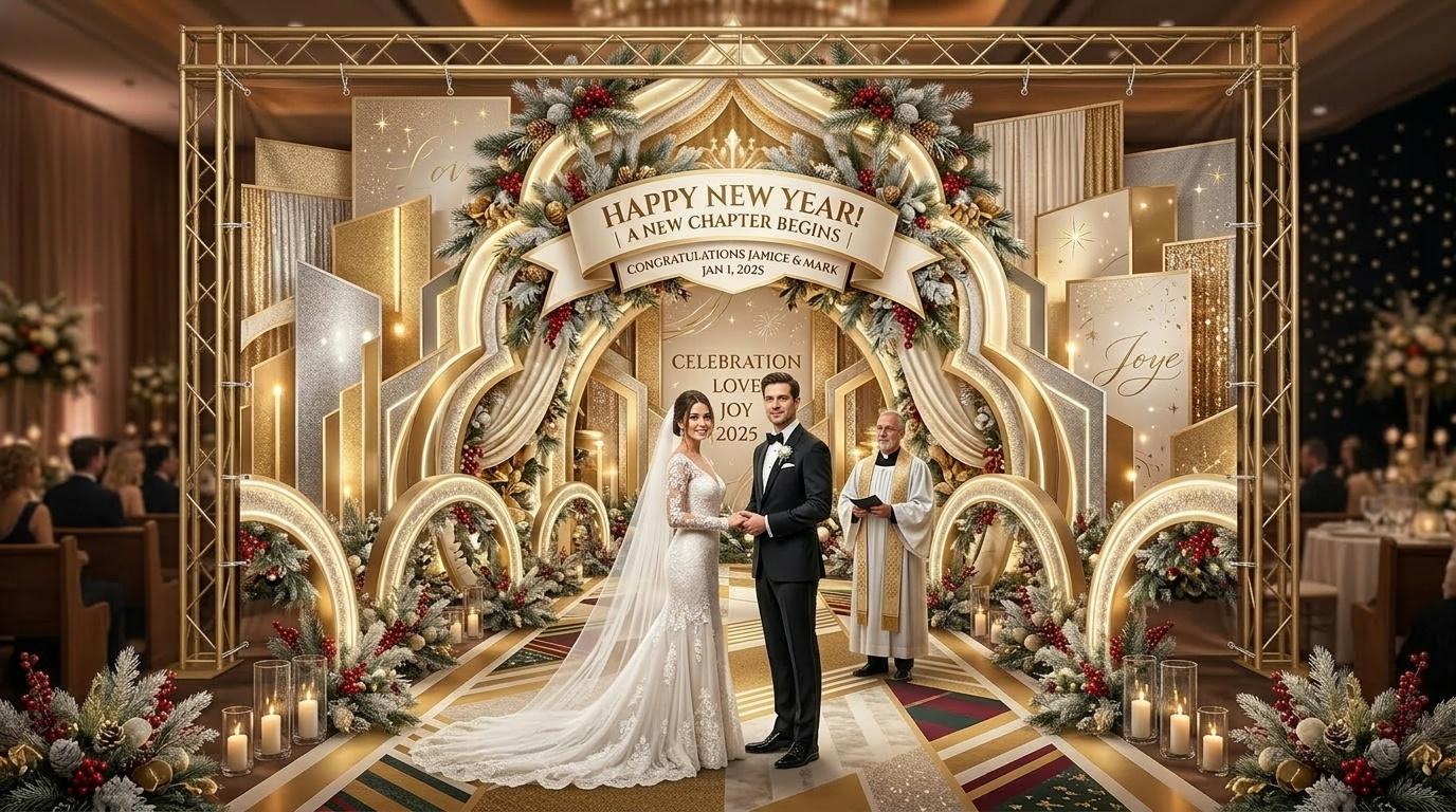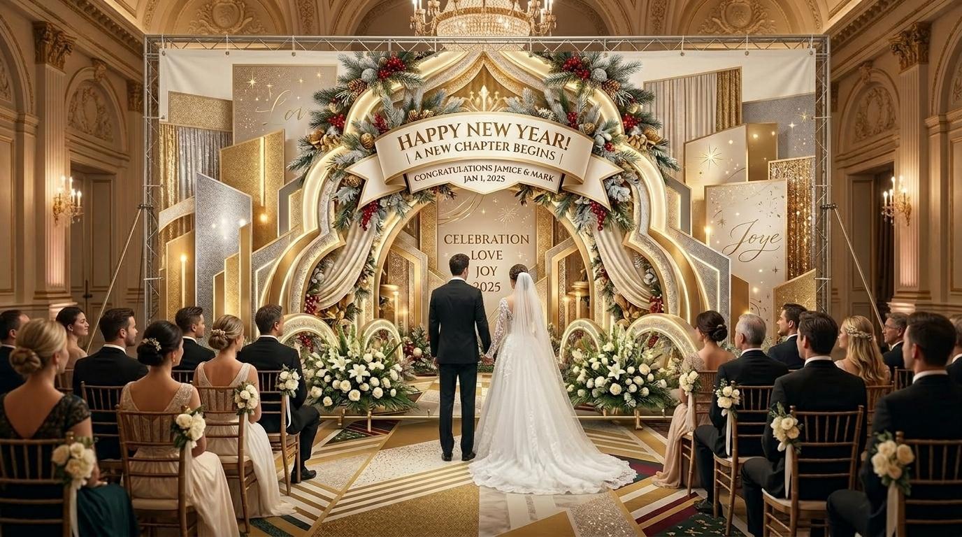 Wedding banners are more than just decorations—they’re the first impression of a wedding, a visual anchor that sets the tone for the entire celebration. According to a 2024 report from the Wedding Industry Association (WIA, March 2024), 78% of couples in the U.S. believe that a well-designed wedding banner can enhance the overall atmosphere of the wedding, and 65% prefer banners with personalized elements that reflect their personalities. The gridiron-inspired elements in this banner aren’t random; they’re carefully chosen to balance elegance, celebration and personal connection, while the New Year motifs add a layer of joy and new beginnings—something every couple hopes for on their wedding day.