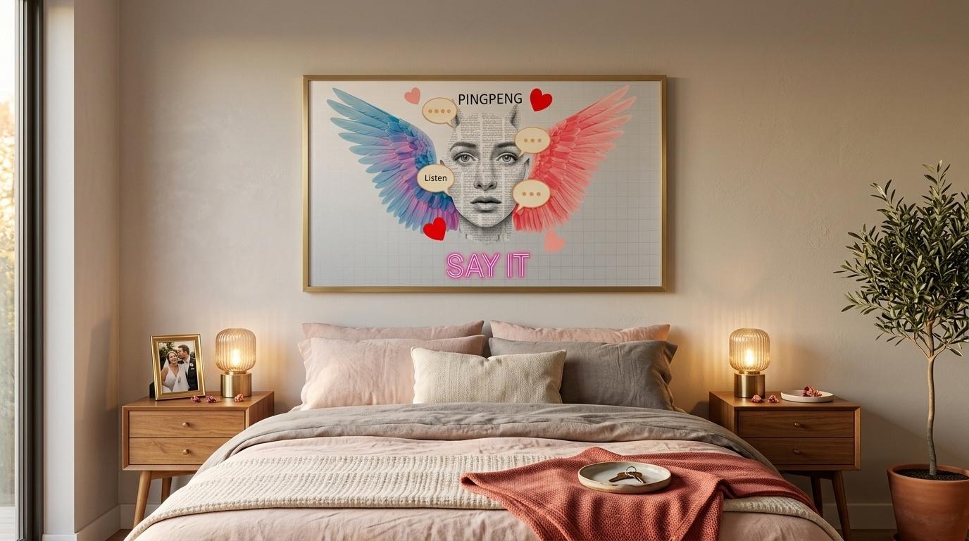 The dialog bubbles and hearts, printed in neon pink and blue ink, are scattered around the Pingpeng, some overlapping, some slightly tilted, like they’re floating in mid-air. The neon ink glows in low light, making the words inside—simple phrases like “I hear you” and “I see you”—stand out even in a dimly lit room. Symbolically, dialog bubbles represent communication, the lifeblood of a strong marriage, while hearts represent love and connection. Together, they’re a quiet reminder that love is built on talking, listening, and being present for each other. The problem with neon ink? It fades. If the poster is hung in direct sunlight for too long, the pinks and blues turn pale, almost washed out. I saw a couple hang theirs outside for a garden wedding, and by the end of the day, the neon was barely visible. But that’s okay. The fading is part of the story, a reminder that love and communication require care and attention—you can’t just set them and forget them.