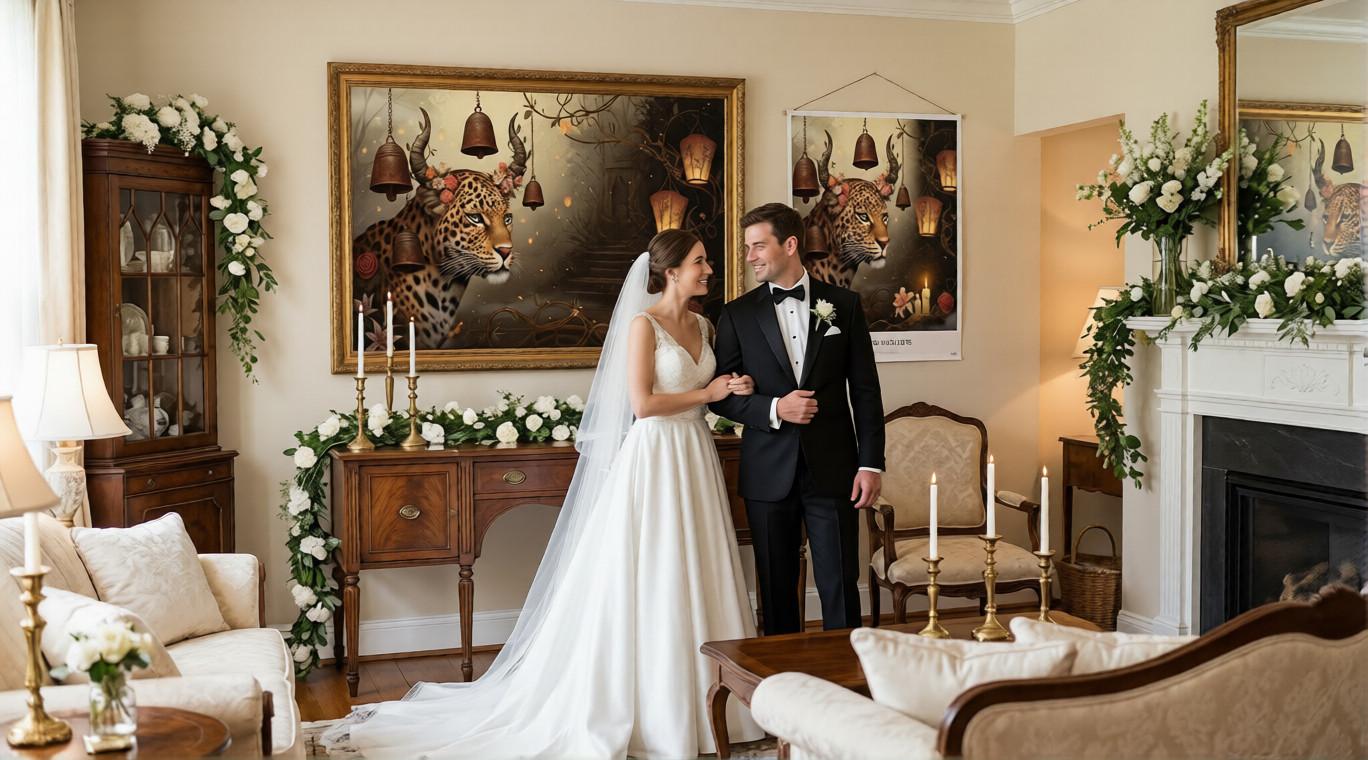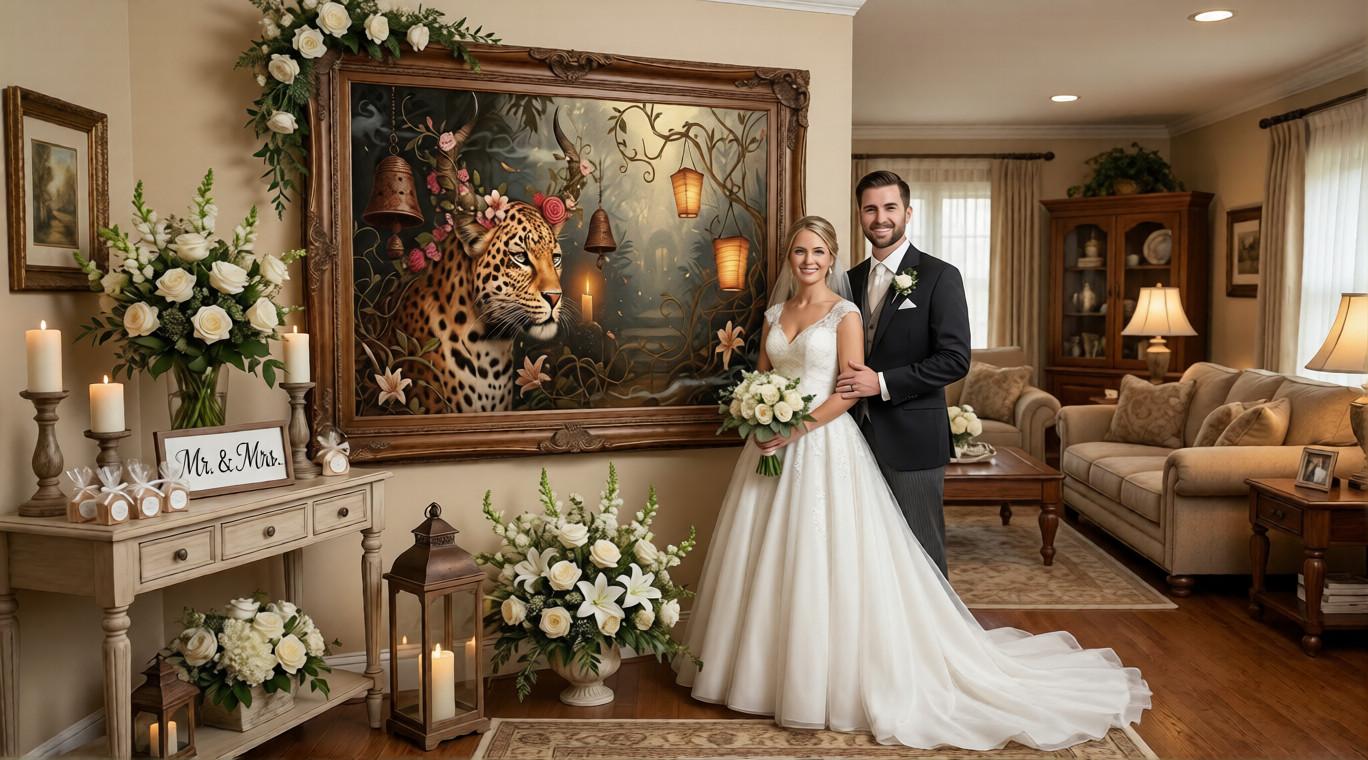 Vigilant Love: Mystic Leopard with Twisted Horns and Rustic Bells Watching Over Bride & Groom Amid Lush Garden Shadows