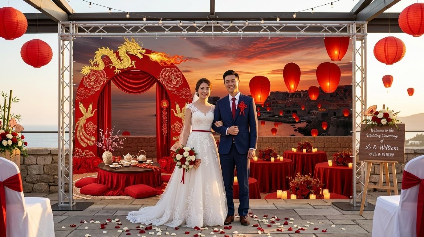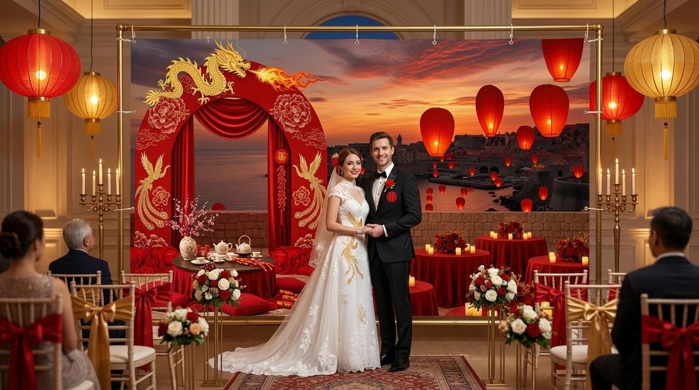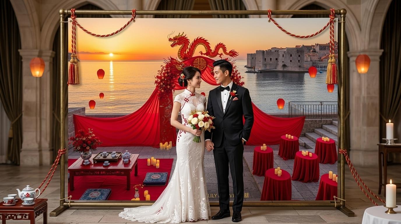 For couples who love Dubrovnik, Lunar New Year, and weddings that feel authentic, not staged, this banner is more than a decoration—it’s a way to tell their story. It’s a way to honor the traditions that matter to them, to embrace the beauty of imperfection, and to create a wedding that feels personal and meaningful. It’s a way to turn a destination wedding into something unique, something that reflects who they are as a couple. The banner’s elements—stone walls, red lanterns, dragon dance, tea ceremony—are not just decorative; they are symbols of love, strength, prosperity, and new beginnings, all wrapped up in a scene that feels like a moment frozen in time.
