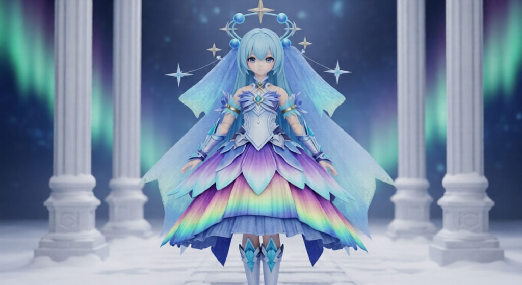 - Multi-layer aurora-veil skirts with floating crescent shards