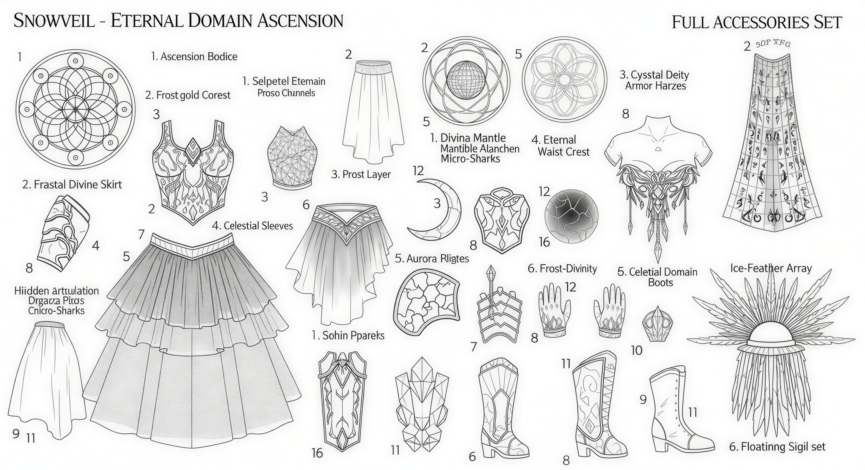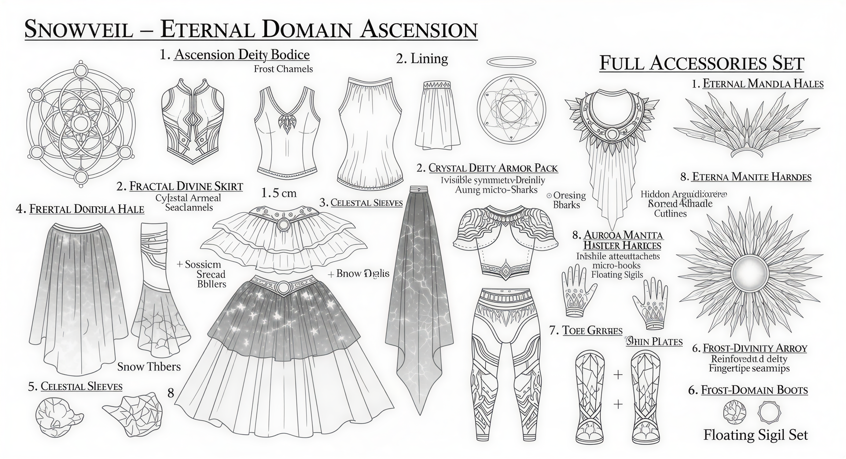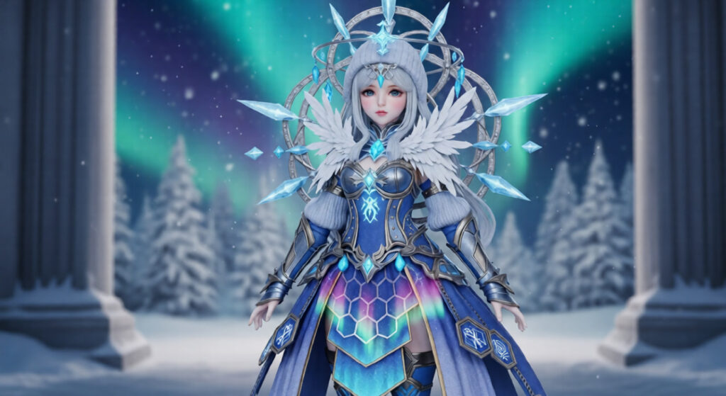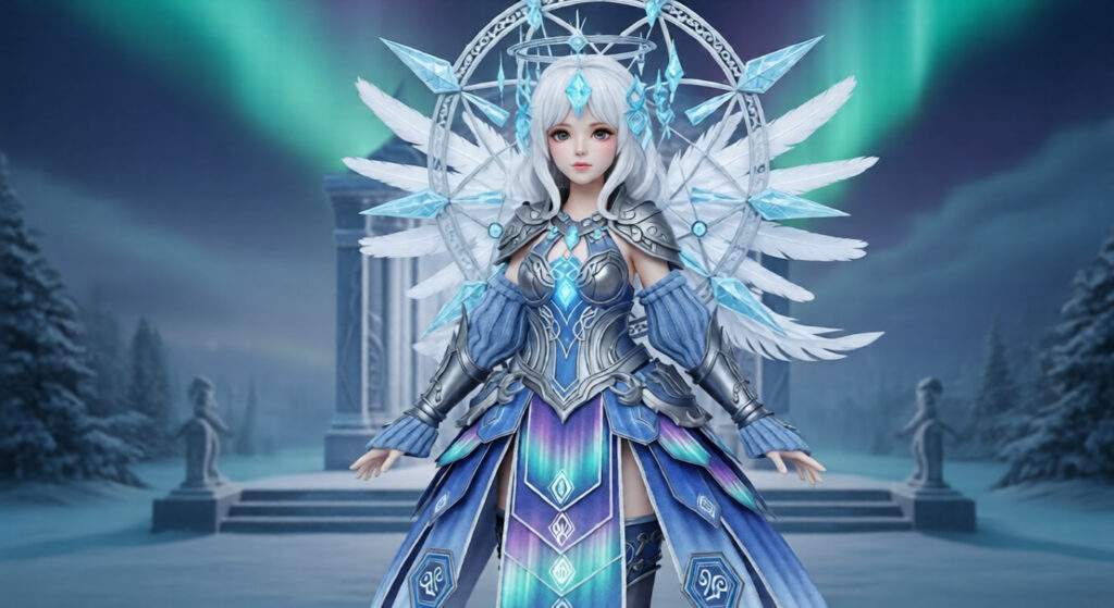 A flowing astral mantle, eternal ice-feather arrays, and suspended cosmic sigils complete the transcendent appearance—while every motif remains fully original and safe.