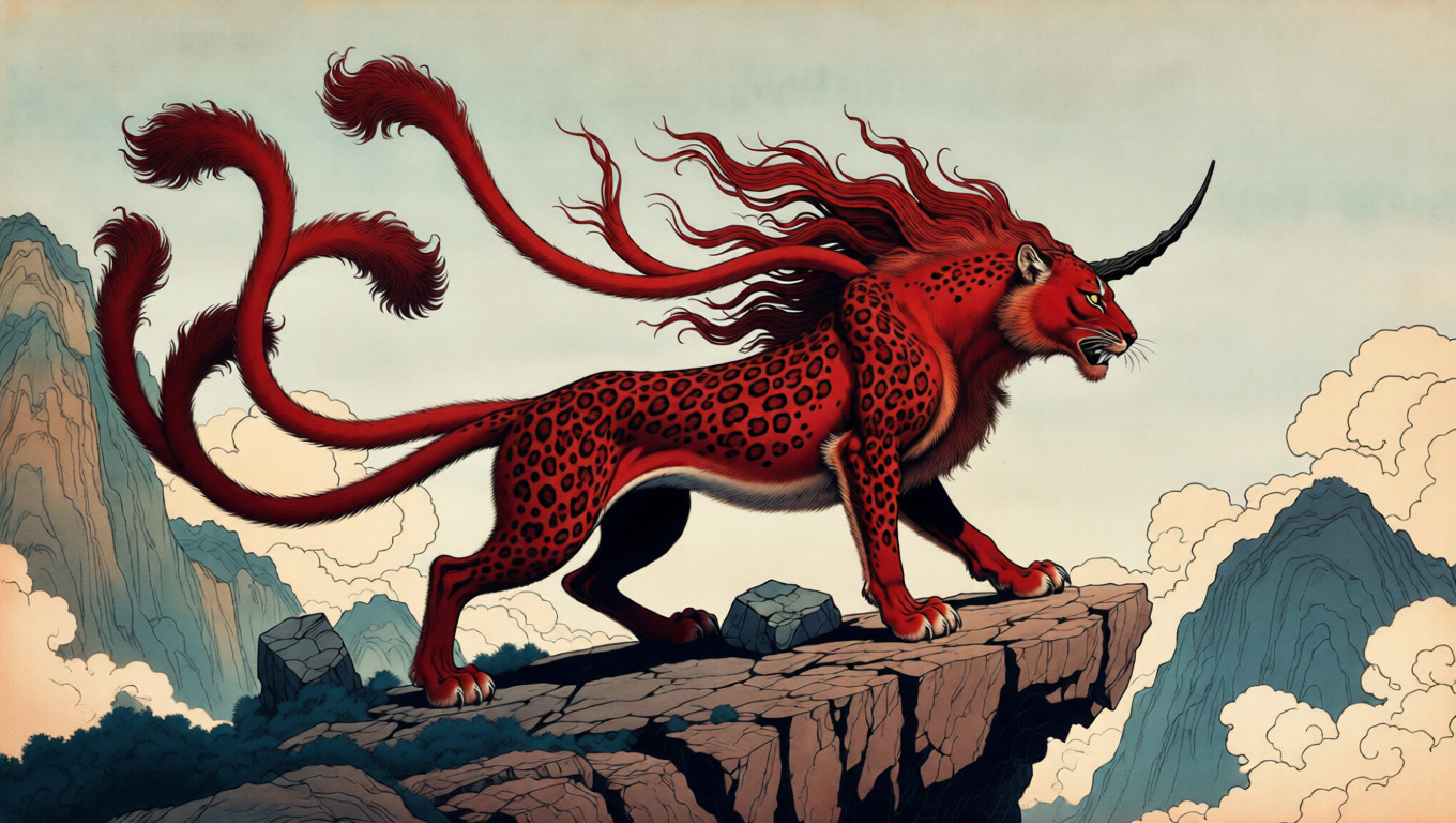 Zheng Mythical Beast Poster – Five-Tailed Red Leopard of Freedom from Shan Hai Jing