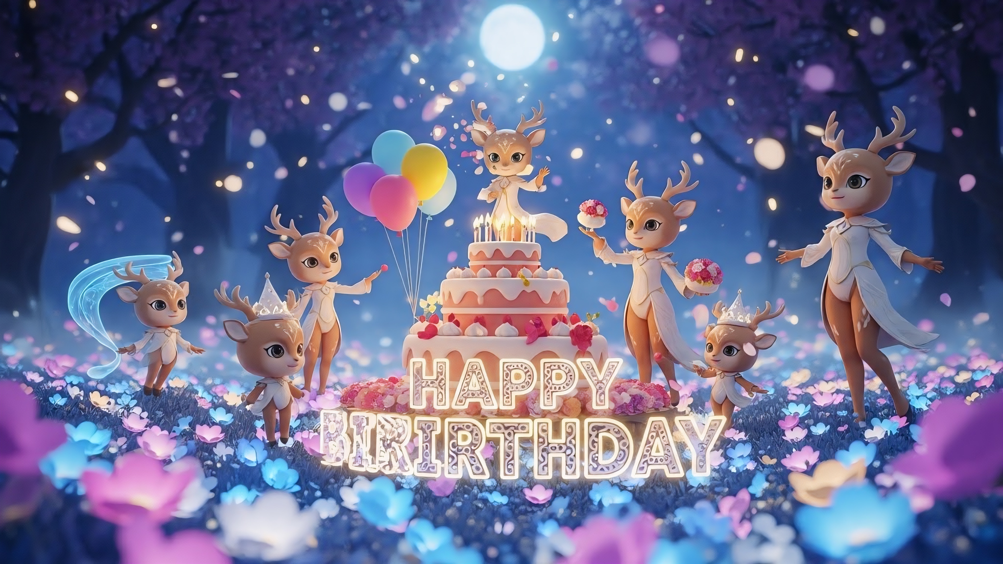 Lucky Deer Spirit Trio in a Phantasmal Flower Forest – 3D Chibi Fantasy Birthday Banner