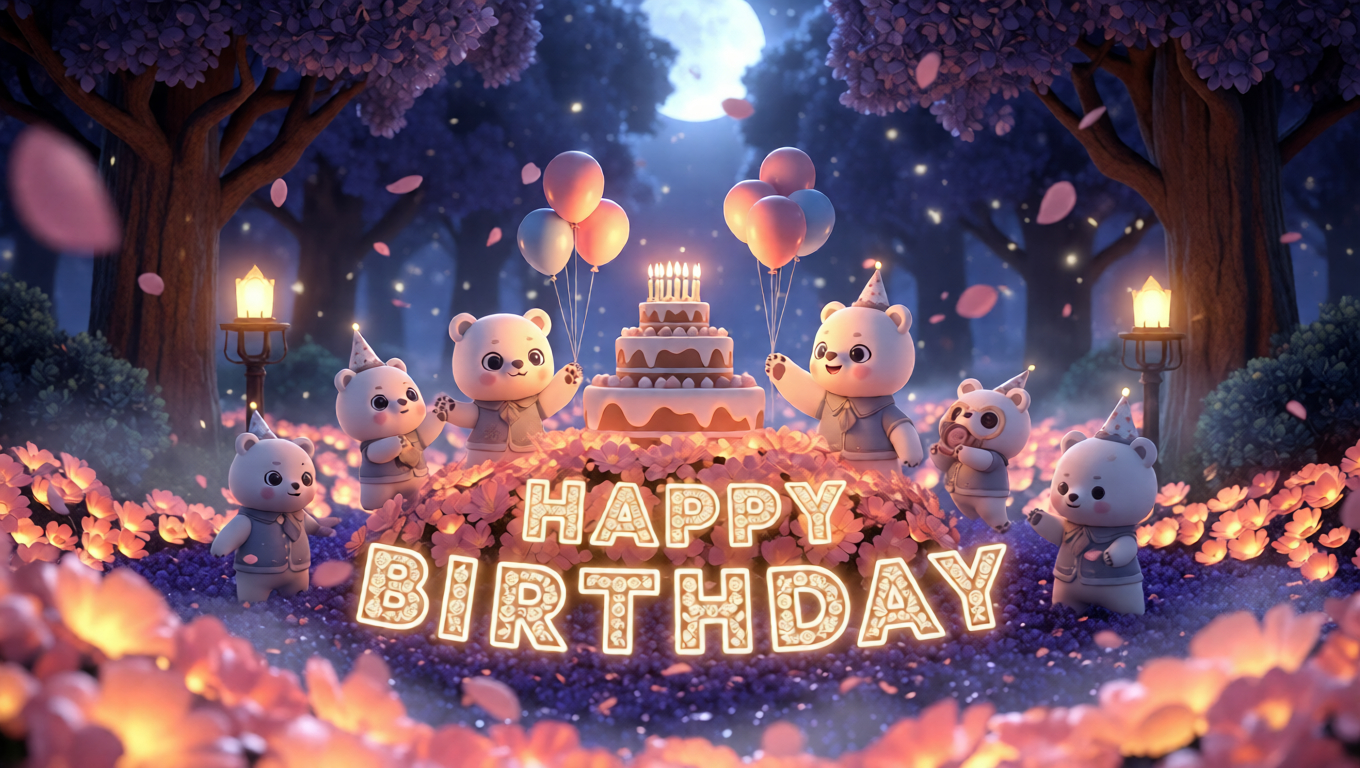 Lucky Bear Spirit Trio in a Phantom Flower Forest – 3D Chibi Fantasy Birthday Illustration