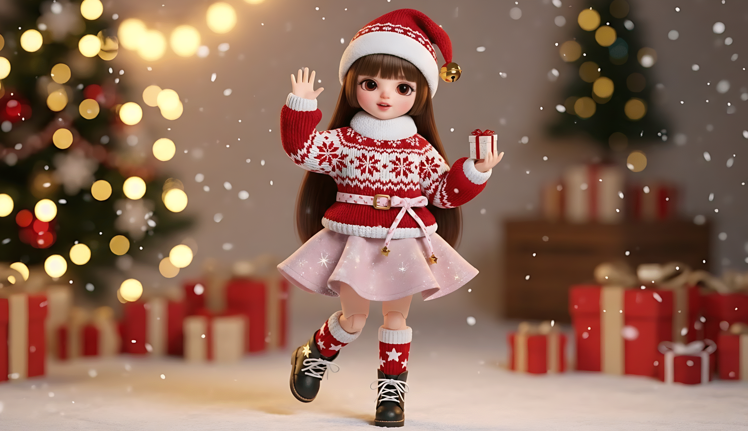 A cute Q-style 3D doll outfit featuring a festive knit sweater, mini skirt, pom-pom hat, and sparkling accessories for holiday charm.