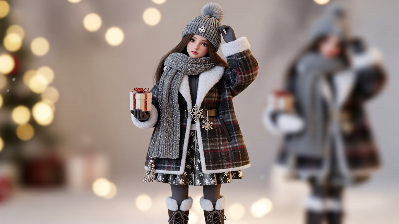 A cozy winter outfit for a Q-style Western female doll, featuring a woolen coat, metallic skirt, knee-high boots, and festive accessories.