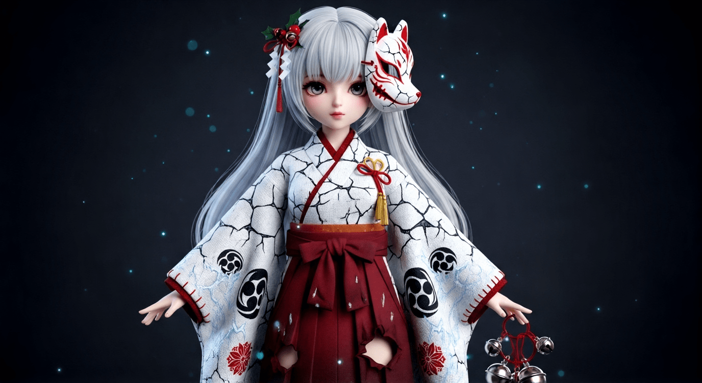 A hauntingly beautiful Japanese horror Christmas outfit designed for female dolls. This original costume blends shrine maiden ceremonial shapes, icy ghost motifs, and eerie festive symbolism—creating a chilling holiday aesthetic perfect for collectors who enjoy dark-themed Christmas fashion with a Japanese twist.