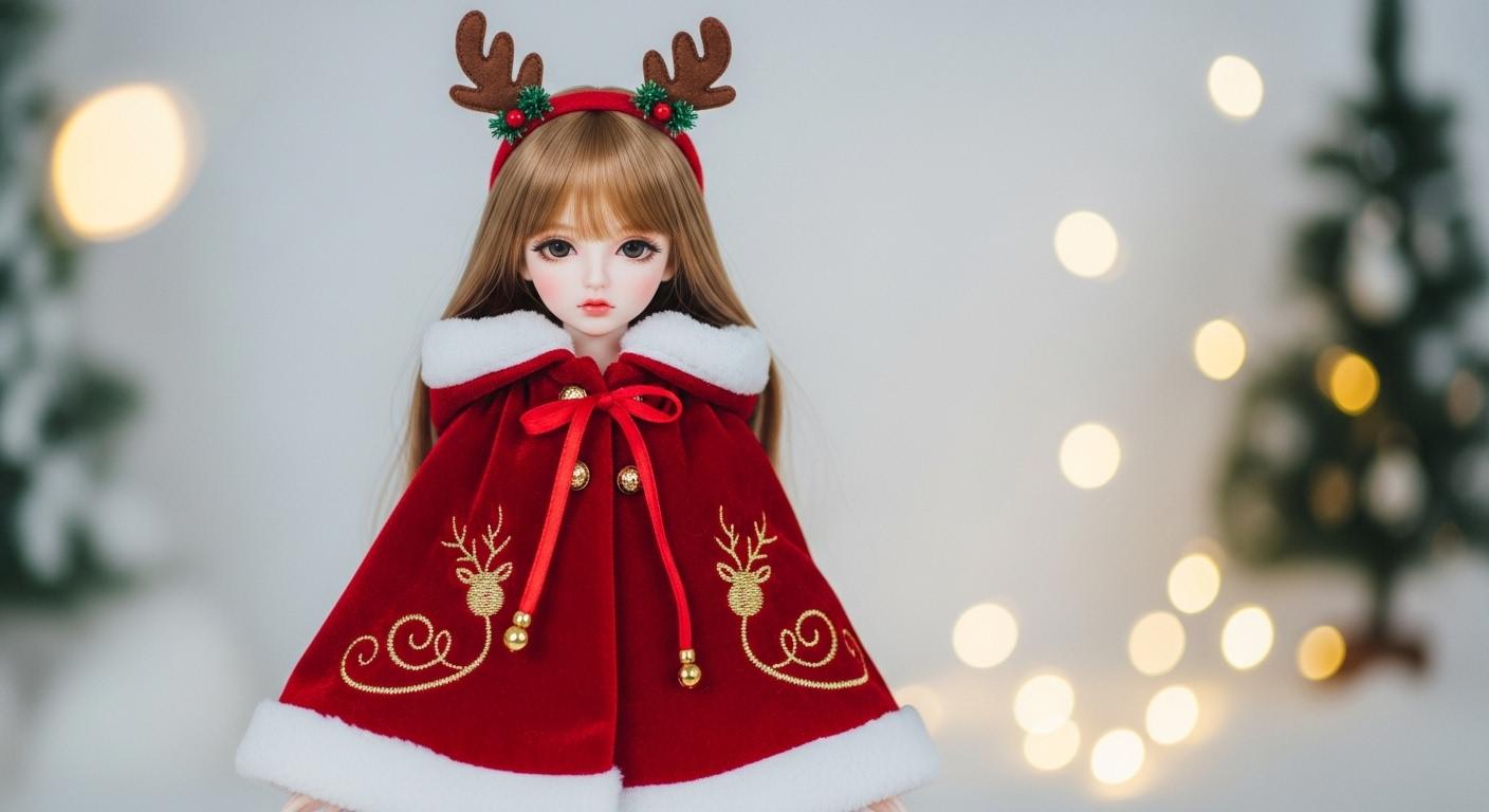 Add festive elegance to your 30cm fashion doll with this handmade red velvet Christmas coat featuring a reindeer antler hood, white fur trim, and gold embroidery. Perfect for collectors and holiday photoshoots.