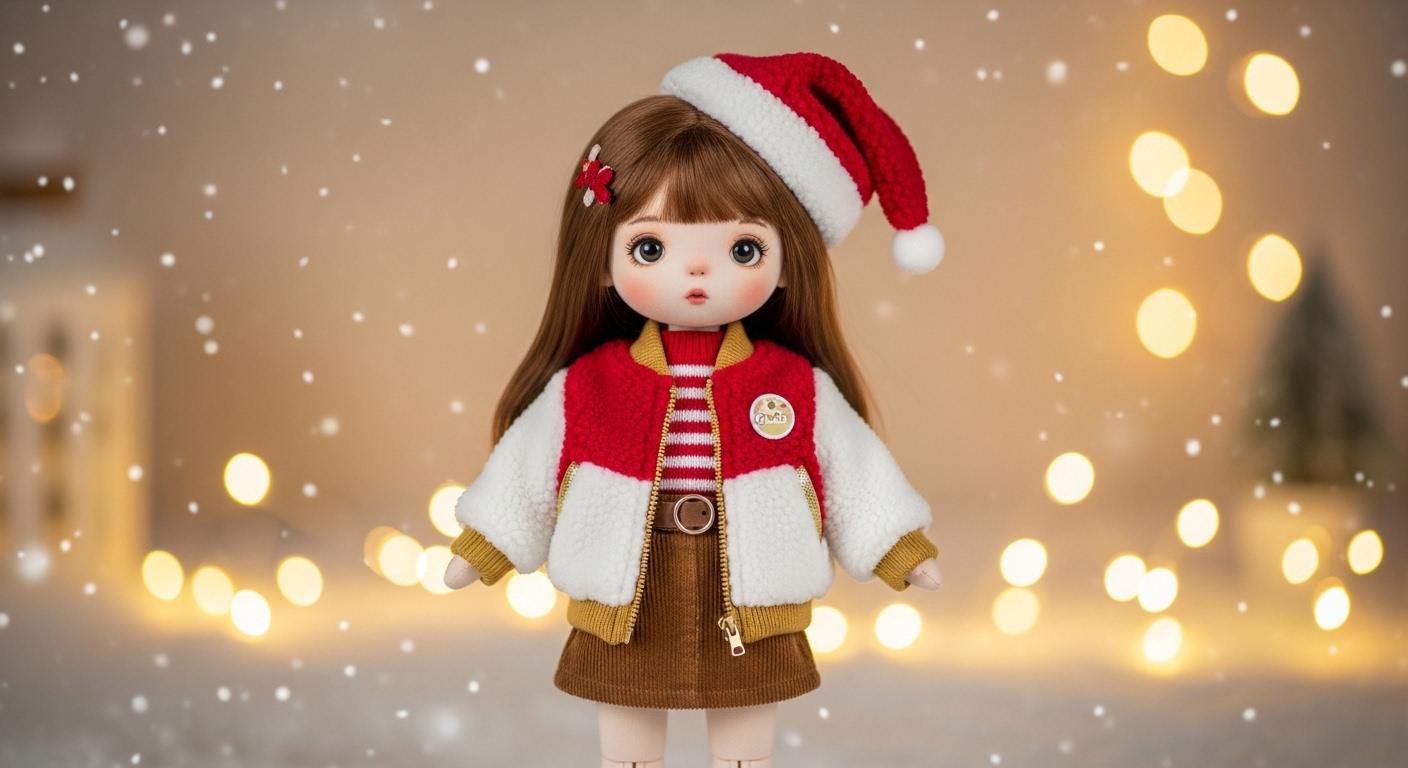 Download the free “Touchdown Holiday Girl” sewing pattern for 20cm ragdolls! Create a sporty yet festive outfit featuring a fleece bomber jacket, mini skirt, and Santa-style cap — the perfect handmade Christmas look for your doll collection.