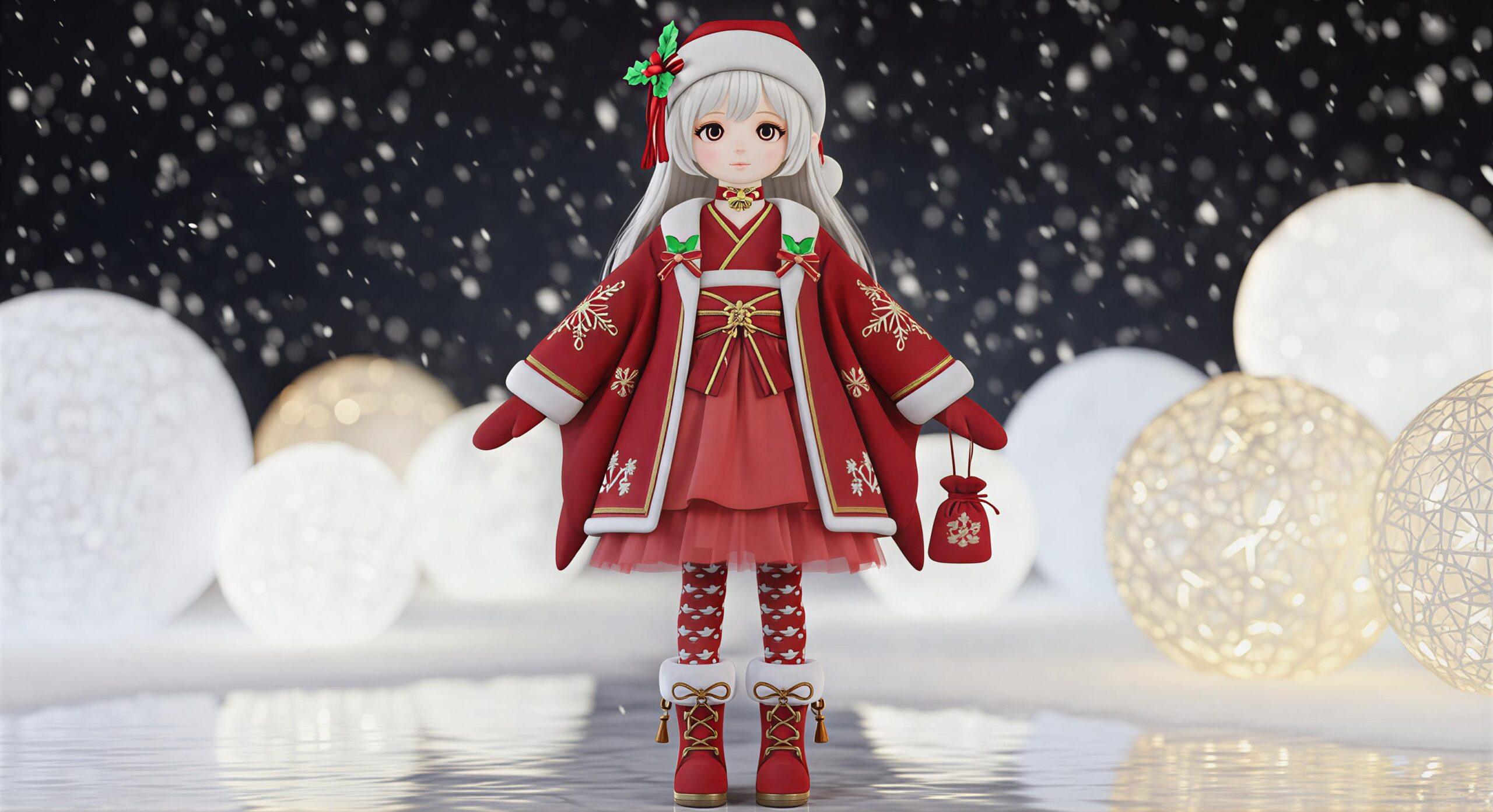 A soft, Japanese-inspired Christmas outfit designed for full-size elf dolls. This set includes a hybrid kimono-style coat, festive wa-dress, and a complete accessory collection, supported by a detailed sewing pattern with full measurements.