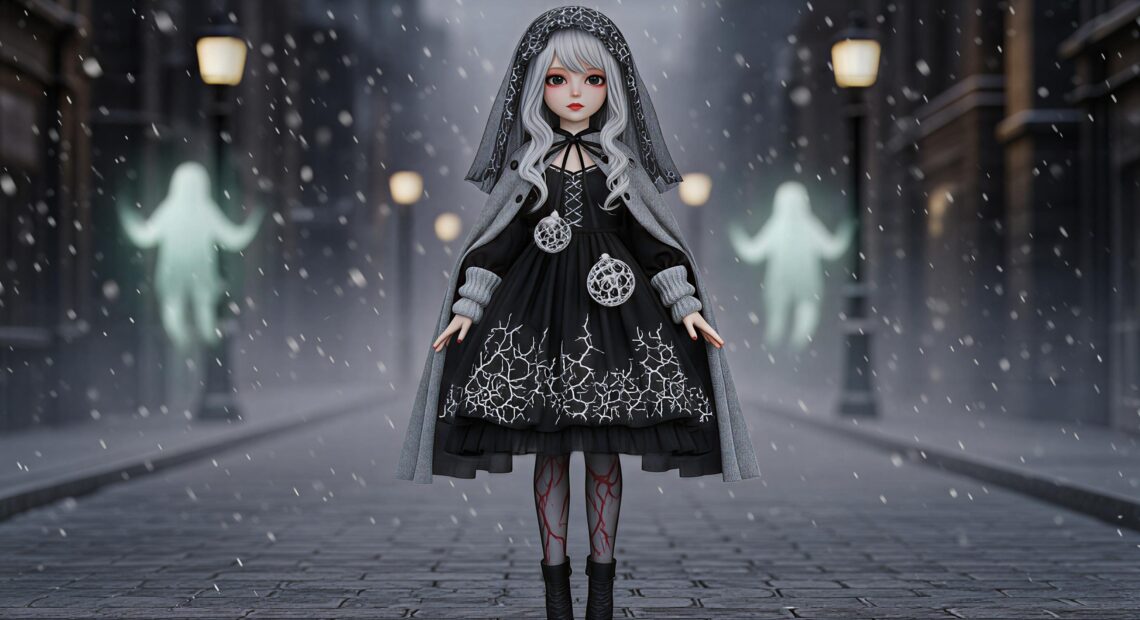 A dark and elegant Japanese-horror-inspired Christmas outfit for 3D female dolls. Featuring frost-vein motifs, cracked-glass ornaments, a ghostly cape, and a complete accessory set.