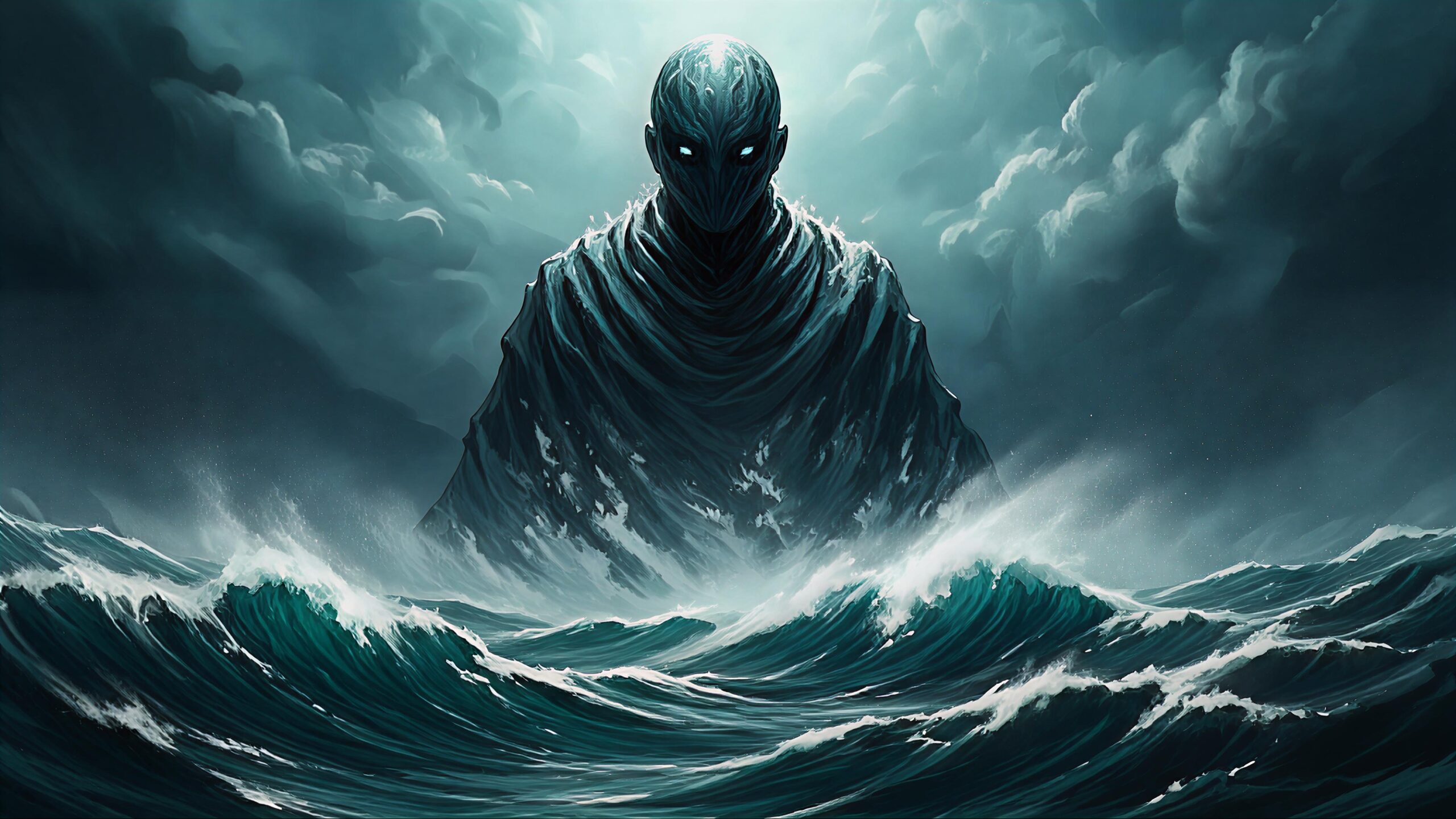 A textured impasto oil-painting of the mythic Umibozu sea spirit—solemn, atmospheric, and perfect for modern fantasy or coastal décor.