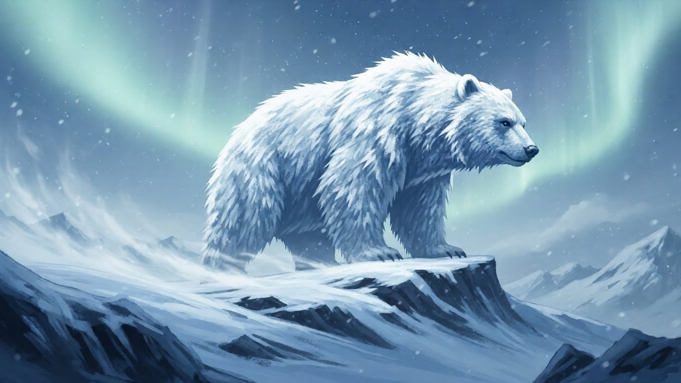 A Nordic-inspired winter landscape poster featuring the mythical Snowborne Titan Bear, rendered in atmospheric painterly style with icy aurora lighting. Decor-friendly and includes a free poster blueprint download.